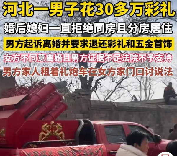 败诉的消息传来,男方家属彻底坐不住了。2月25日,他们直接租来礼炮车,停在女方家门口"硬核讨说法"。现场红旗一展,材料一举,礼炮车的喇叭循环播放诉求,瞬间引来大批群众围观,把女方家门口堵得水泄不通。这场面,比村里办喜事还热闹,就是这份"热闹"里,满是无奈和荒诞。