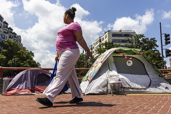 一名行人走过华盛顿环岛无家可归者的帐篷。美国总统特朗普在白宫新闻发布会上宣布,将在华盛顿特区部署国民警卫队,声称该地区的犯罪"失控",誓言要清除首都的无家可归者营地。