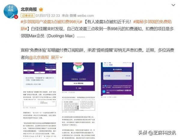 如果说灵动岛广告只是"视觉骚扰",那么今天冲上热搜的"多邻国用户凌晨 3 点被扣费 998 元"事件,则彻底透支了信任。
