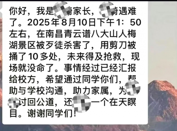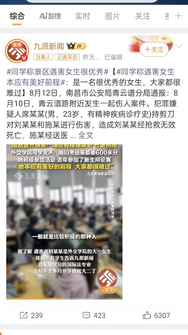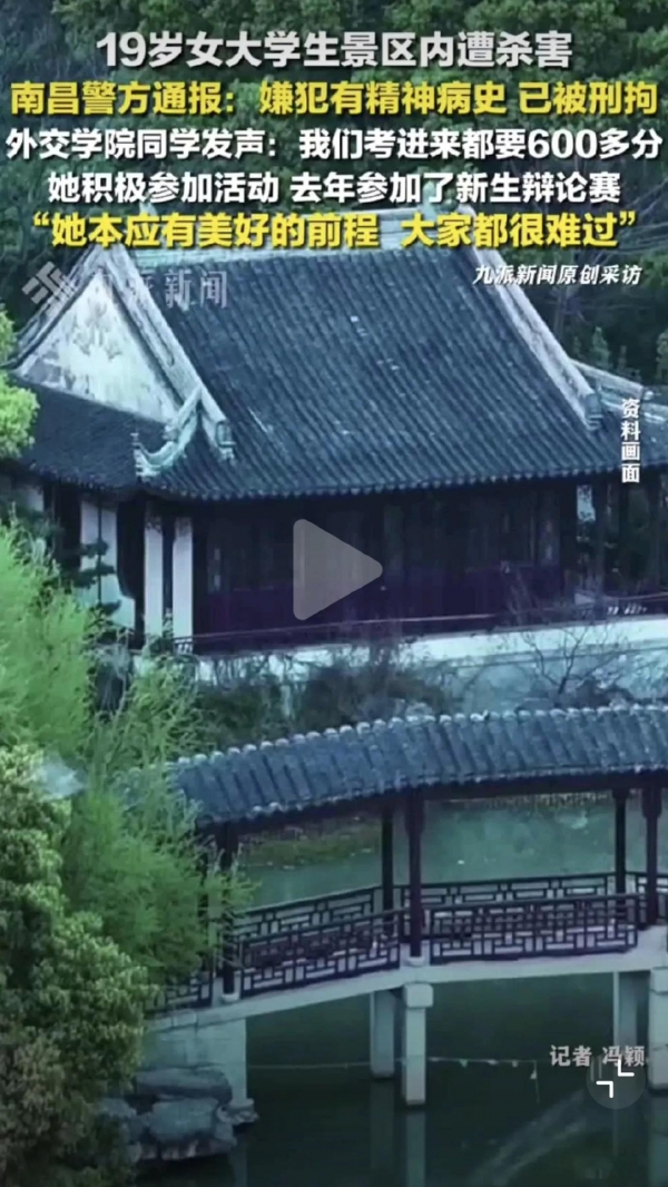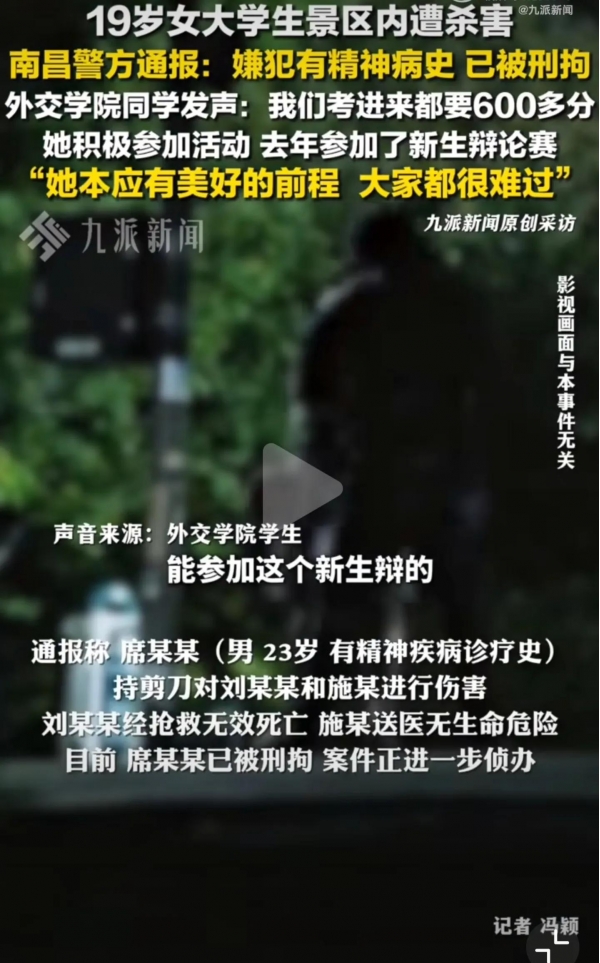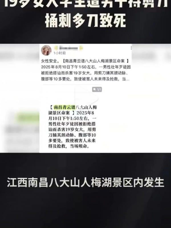 8月10号下午1点左右,19岁女大学生刘某某和朋友在江西南昌青云谱区八大山人梅湖景区拱桥附近景区里拍照,一个陌生男子骑着电动车过来搭讪,被拒绝后拿出剪刀对刘某某要害部位连捅数刀,连同行的朋友和帮忙的路人也都被划伤。