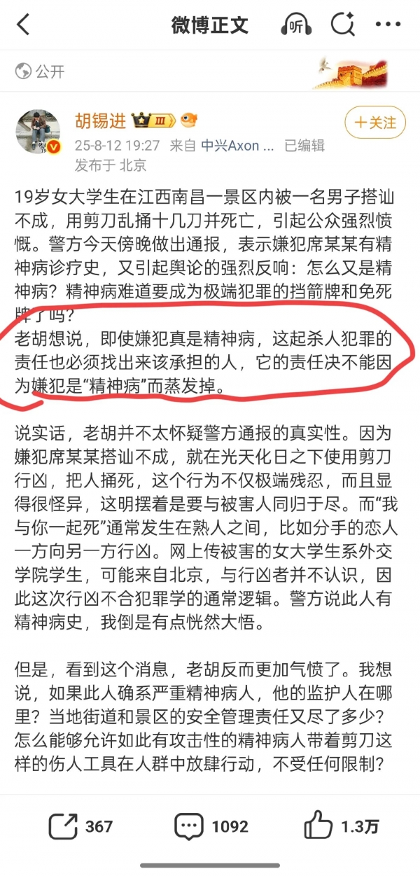 连胡锡进都站出来说,必须严格鉴定程序,不能让恶性犯罪者借精神病逃避惩罚。