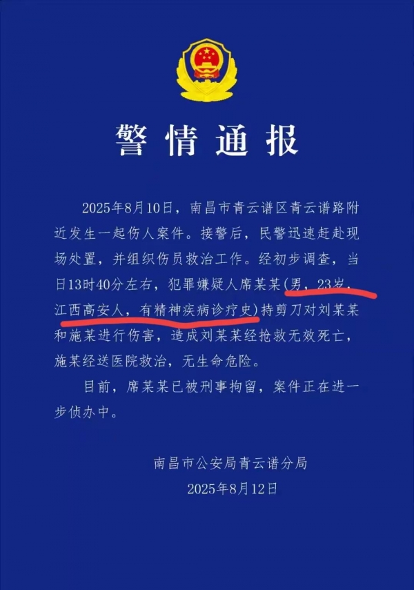 8月12日南昌公安局青云谱分局发了通报,通报里面说这男子叫席某某,23岁,江西高安人,有精神疾病诊疗史。