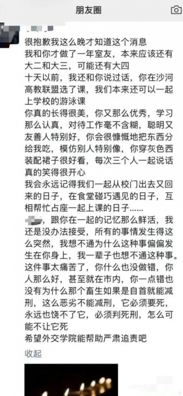 受害者的室友在朋友圈里回忆着自己与受害者大学时光的点点滴滴,表示自己无法接受刘某某的离开,朋友圈内容里字字流露出来的都是对女孩离开的不可置信,对凶手的痛恨。