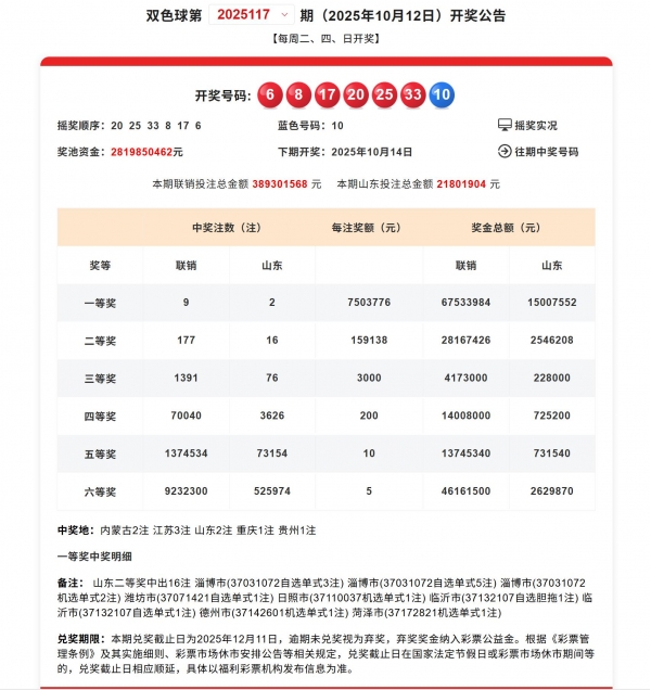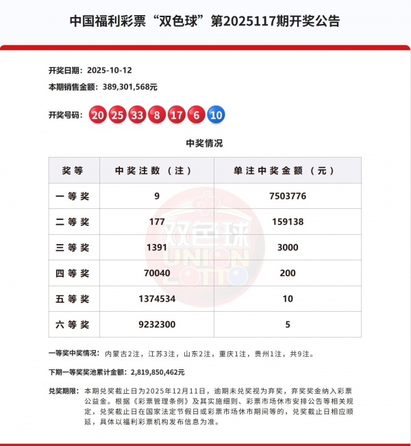 北京时间2025年10月12日双色球第25117期开奖,本期全国开出9注一等奖单注奖金750余万元!