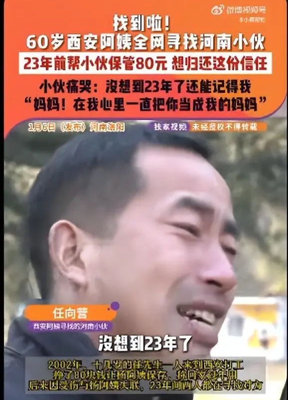 节目播出后,奇迹发生了。人找到了!当年的少年,如今已入中年,在洛阳安稳生活。两人通过视频见了面。屏幕那头,已经失去亲生母亲的男人泣不成声,他说:"没想到23年了,你还能记得我……我2009年的时候妈妈不在了,所以我一直记得你的好。"