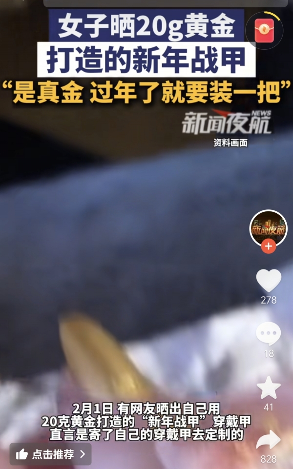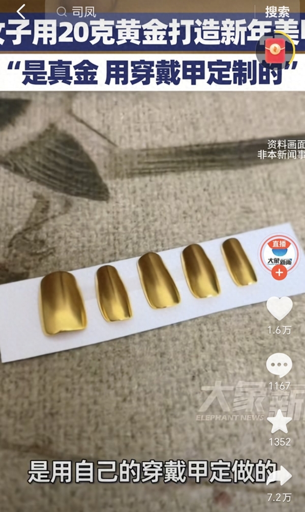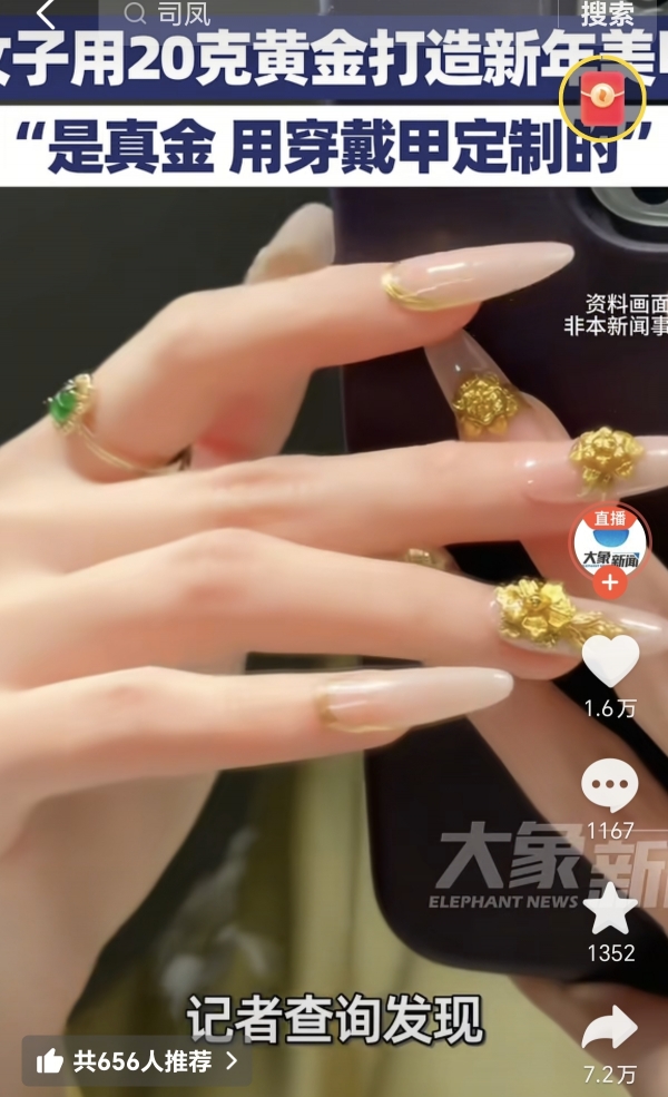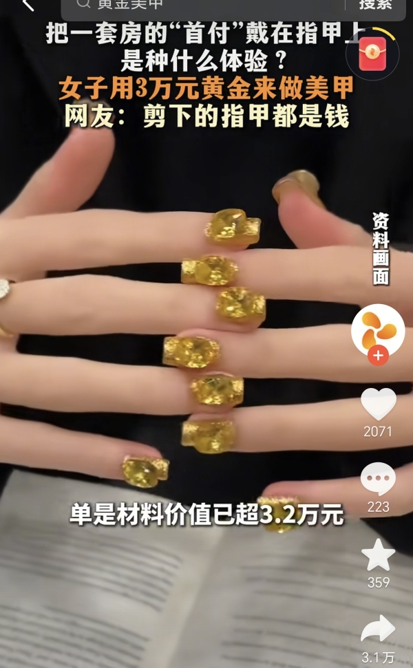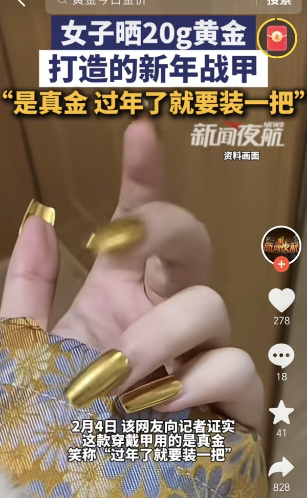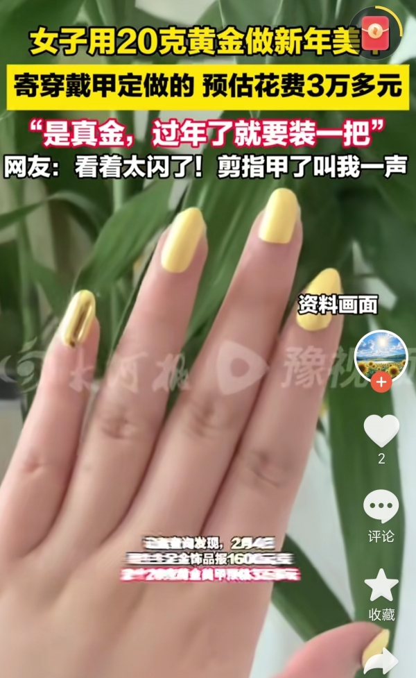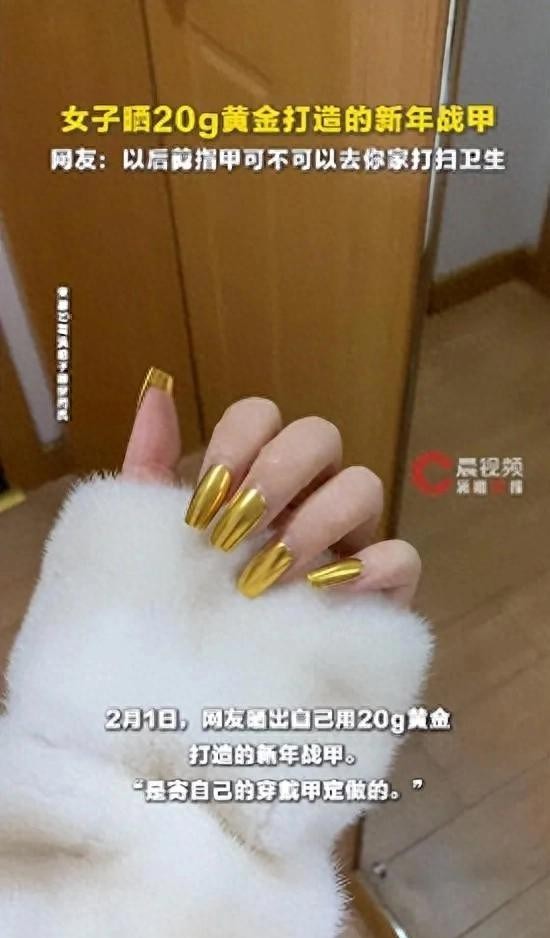准备过年期间有人晒出自己花三万块钱做的黄金指甲,说是"过年要装一把"。这事儿发生在2月1号,到2月4号记者去问,对方还特意强调指甲是真金。当时足金价格从1498涨到1600一克,涨得挺猛。有人算了算,这个指甲得用20克黄金,总价快三万八了。