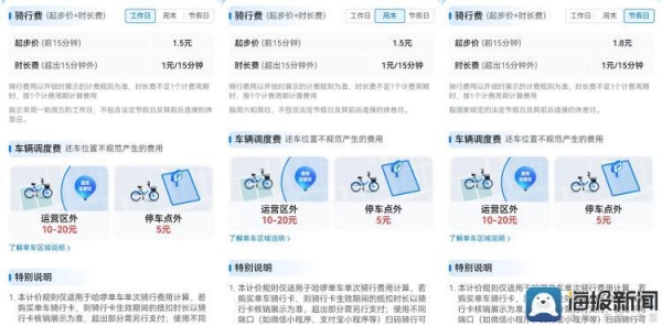 记者注意到,哈啰单车的骑行费为起步价+时长费,并区分工作日、周末、节假日。工作日起步价为前10分钟1.5元,超出10分钟外每15分钟1元;周末和节假日起步价为前10分钟1.8元,超出10分钟外每15分钟1元。