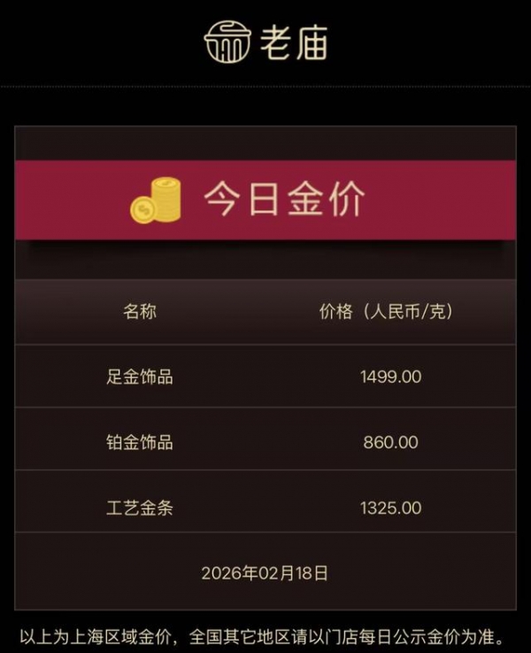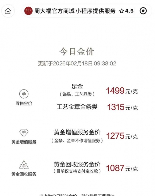 今年开年以来,消费者对"一口价产品还会涨"的共识更强,抢在调价前买单,意图很明确:避涨。1月,周生生对定价类饰品如转运珠、联名款、金镶钻上调10%-13%;潮宏基紧随其后,多个一口价系列涨幅从几百到上万元。2月18日原本行业集体回落到1500元/克下方,周大福、老庙黄金1499元/克、六福珠宝1497元/克,周生生1500元/克、老凤祥1510元/克,谁料随后金价即刻反弹,国内终端又被推回上行通道。