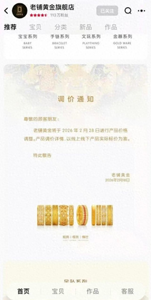 老铺黄金已官宣:2026年首轮调价定档2月28日,方向明确向上。