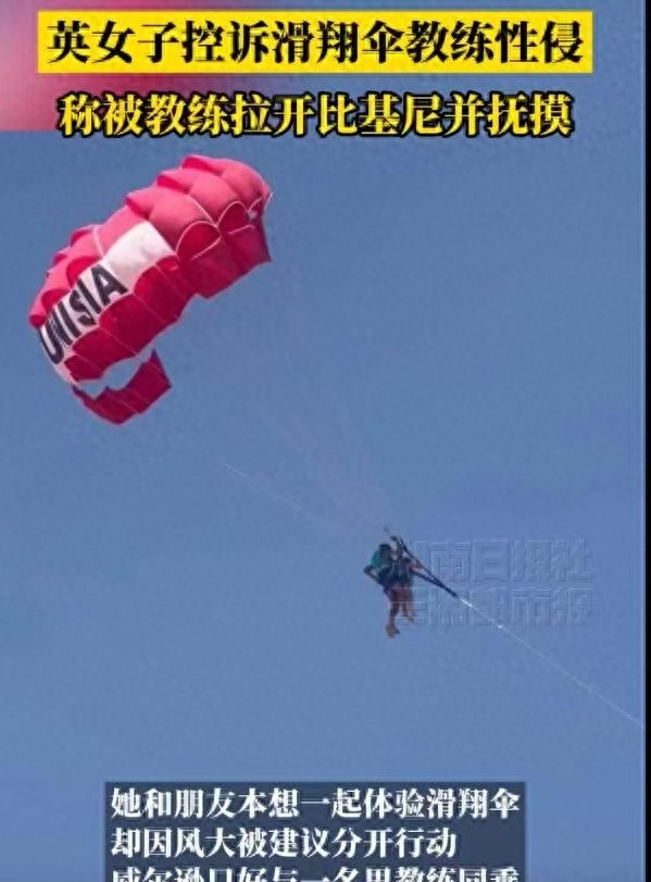 男教练在飞行过程中突然靠近她,双腿跨在她身上,一边拉伞一边把手伸到她腿上。威尔逊说对方还用阿拉伯语说话,直接拉开她的比基尼往下摸。她回忆当时特别害怕,全程感觉被压制着动不了。