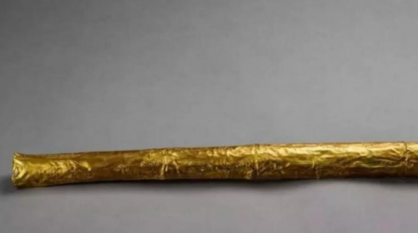 刘二这句话只能算是开玩笑,王老全虽然经常来看东西,但大多是一些烂铁片之类的东西,从来也没有什么真正的好东西。王老全也顾不得刘二的打趣,他赶忙从袋子里将那根棍子拿出来,然后递给刘二:"今天还真是走运了,你看这根棍子,我掂量着可不轻"。刘二接过棍子仔细地看来看,果然够沉,他用水一洗,只见刚才还脏兮兮的棍子竟然透出了金色的光泽。
