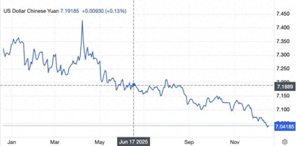 站在今年年底回头看,人民币这一年的走势让很多人没想到--它不但没跌,反而涨了不少。年初贸易摩擦刚开始时,人民币一度贬到7.4。当时很多人还照着2018年贸易冲突的老经验推测,以为人民币会继续贬值,甚至可能破8。但实际情况恰恰相反,人民币从4月份的低点7.4开始一路走高,到现在已经升值了4%,离7这个关口只差一口气。
