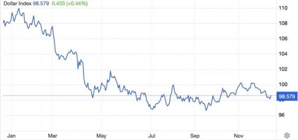 这是美元指数今年的走势。能明显看出,美元上半年就跌了差不多10%,下半年基本在98附近震荡。