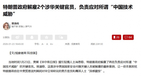 报道指出,这两名官员是在拜登时期任命的,其主要工作目标便是限制中国商品进口和中企在美国的业务活动,理由则是美国的国家安全受到威胁。而现在特朗普政府将其开除,令美国对华鹰派"深感震惊"。
