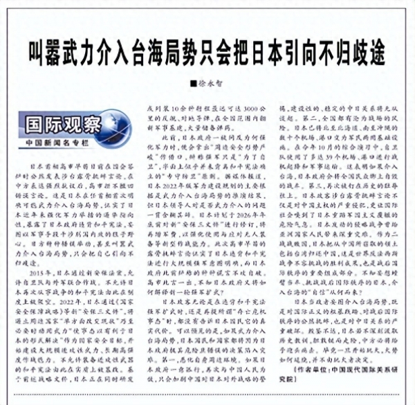 11月16日《解放军报》头版刊发评论员文章,标题直指《叫嚣武力介入台海局势只会把日本引向不归歧途》。