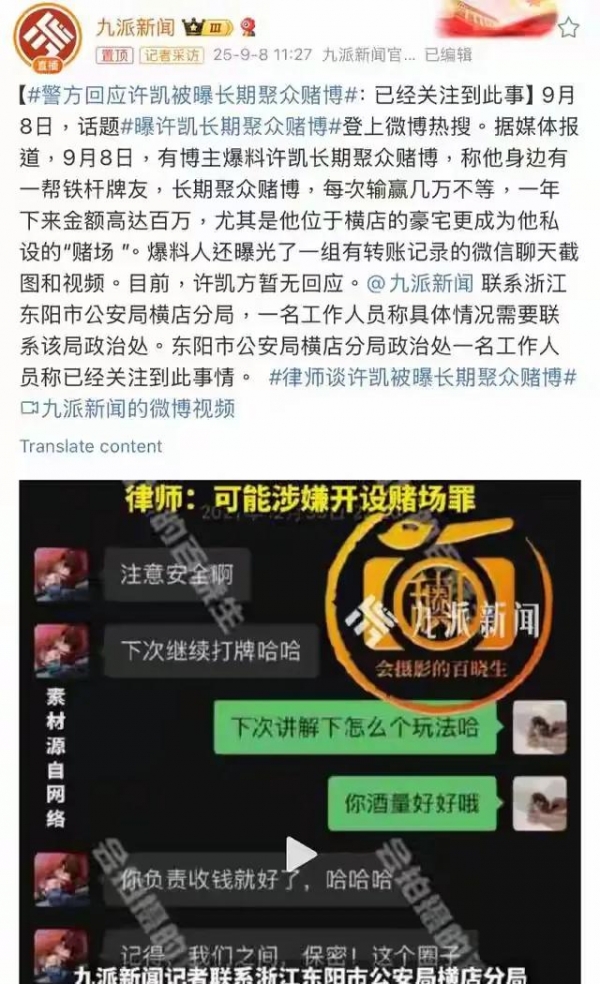 三、许凯被前女友锤"聚众赌博",截图都甩出来了