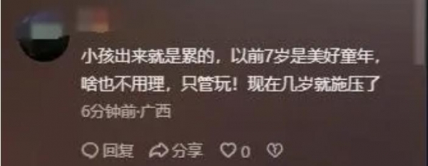 还有人说:小孩出来就是累的,以前7岁是美好童年啥也不用理,只管玩,现在几岁就施压了!