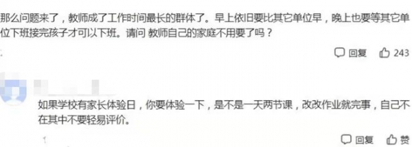 课后延时服务,让部分老师的工作时长增加,即便不上课,只需看管学生自习,但同样无法回家,从事教师工作的多是女生,每晚9、10点才能到家,让她们根本没什么时间去照顾自己的孩子,基本将全身心力都放在了班级学生身上。
