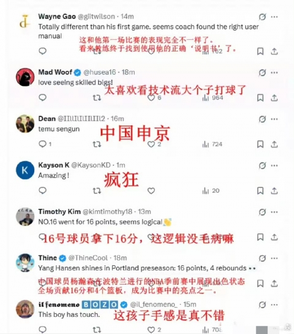 而在杨瀚森爆发助力开拓者拿下胜利之后,外网也是掀起热议,网友纷纷对杨瀚森的表现给予高度赞赏。