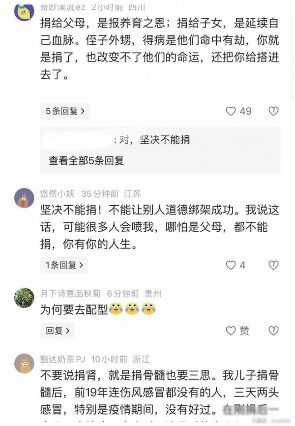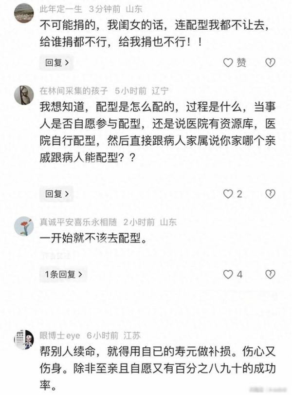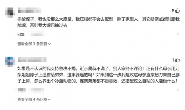 "捐给侄子,我也没那么大度量,我压根都不会去配型,除了家里人,其它啥亲戚都别跟我龇嘴,否则我大嘴巴抽过去",一位网友评论道。