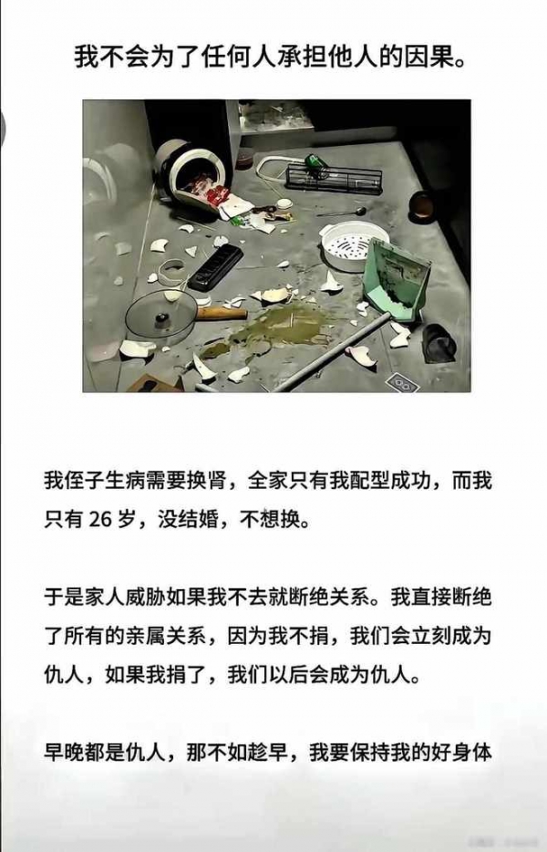 2026年2月10日,杭州一个26岁女孩发帖说,她被全家人堵在家门口,起因是她侄子得了肾衰竭,只有她配型成功,但她不愿意捐肾,家里人说她没有良心,威胁要断绝关系,女孩最后拉黑了所有亲戚,表示如果捐了肾,以后他们也会怪她拖累身体,如果不捐,现在就当她死了。