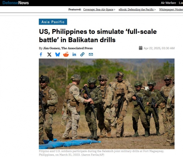 当地时间4月21日,新一轮美菲联合演习正式启动。此次演习代号"肩并肩-2025",旨在验证全面战争场景中,美菲联军保卫菲律宾本土及其周边岛礁、海域的能力。