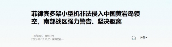 澎湃新闻12月12日转发南部战区微信公众号消息称,南部战区新闻发言人于当天表示,近日,菲律宾多架小型机未经中国政府批准,非法侵入中国黄岩岛领空。
