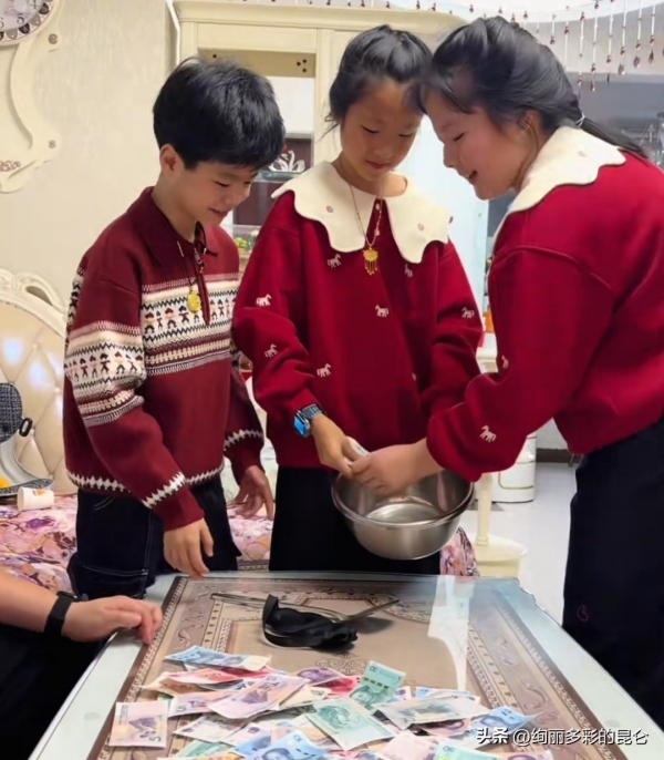 男孩子来铲时,爸爸和高个女孩为了方便他铲到,不时的帮他把钱归拢,可能男孩从来没拿过铲子,配合的不是很好。