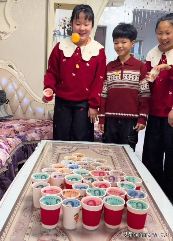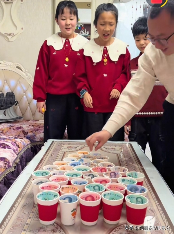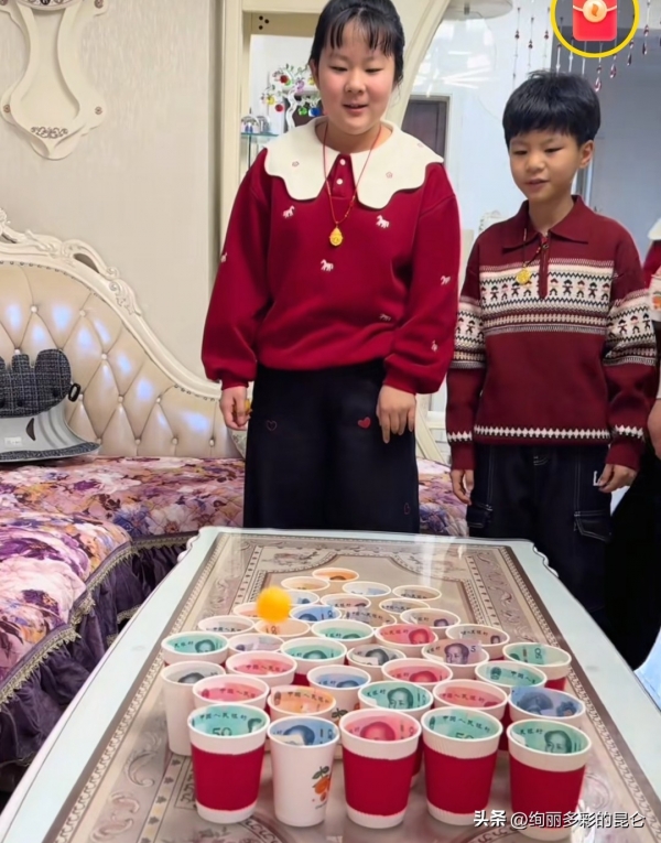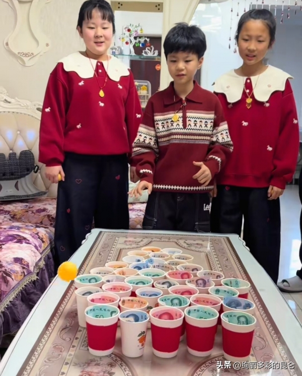 桌子上每个纸杯里都放着一张人民币,面额有10元的,20元的,50元的,还有100元的,规则是将乒乓球投掷在桌上,球弹落到哪个杯子里,就可以拿到那个杯子里的钱。