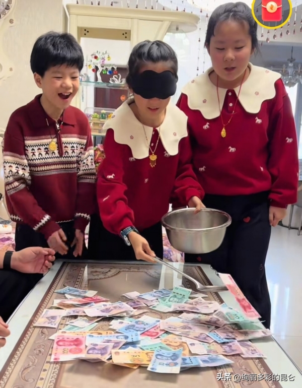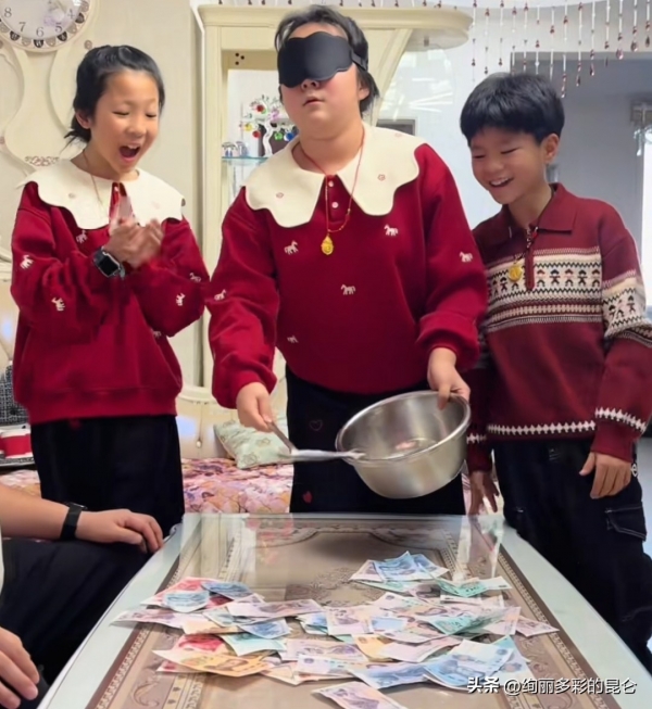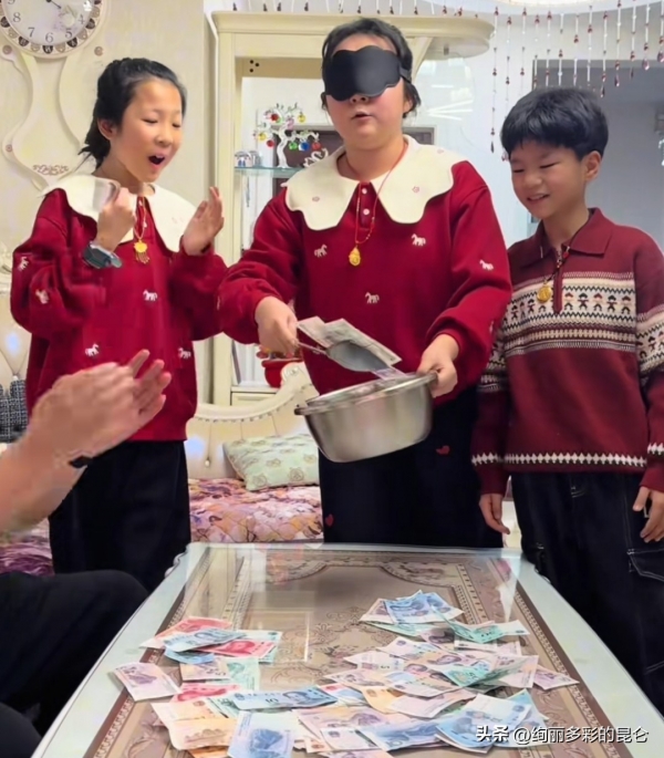 第二个游戏是蒙眼铲钱,桌子上放了各种面额的人民币,孩子要戴上黑色眼罩,然后一手拿铲,一手拿盆,凭感觉往里面铲钱,只要进到盆里就归自己。