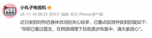 今日对接方发文回应:"早前已看过医生,在照顾调理下目前逐步恢复中,请大家放心。"