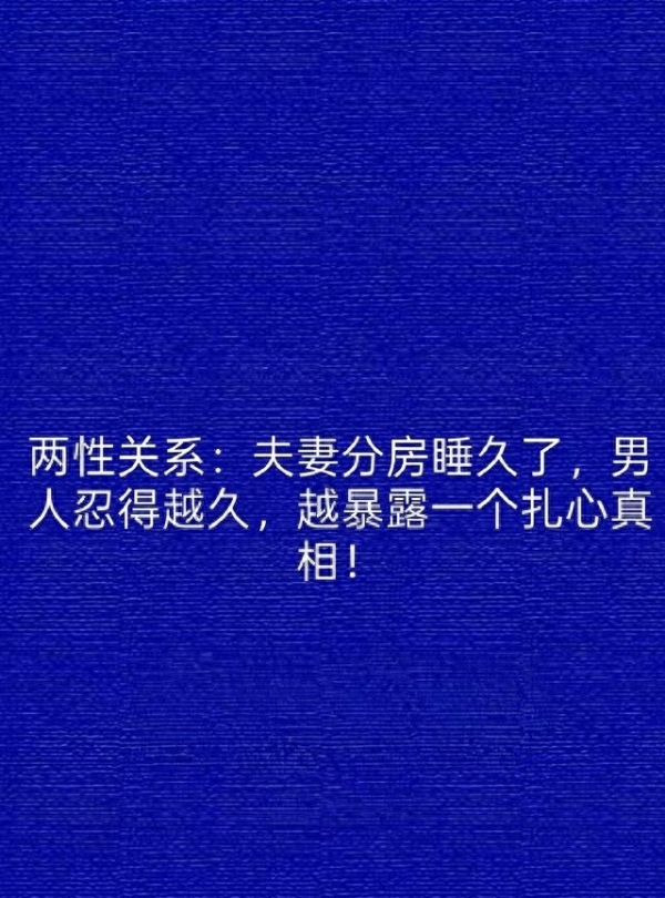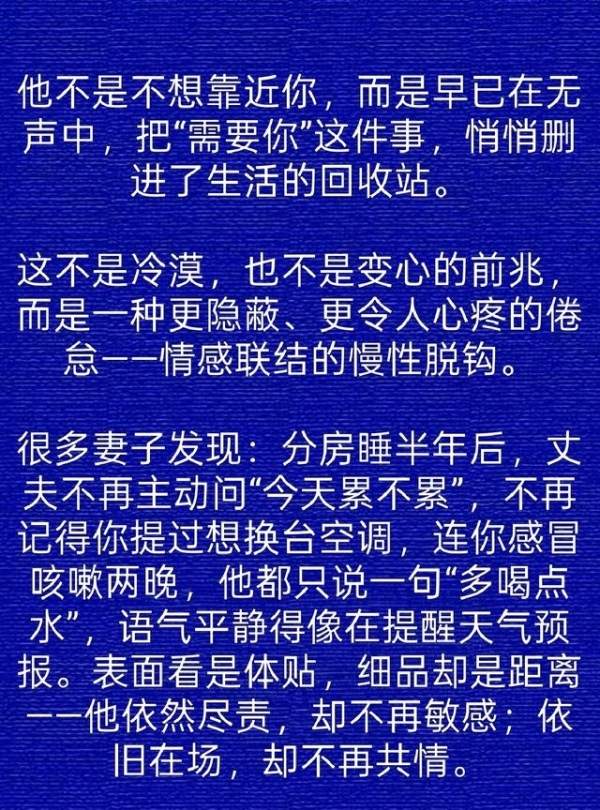当一个男人习惯了分房,习惯了有需求憋回去,习惯了委屈自我消化,他表面看起来越来越"淡定",甚至越来越温和,看什么都说一句"没事"。