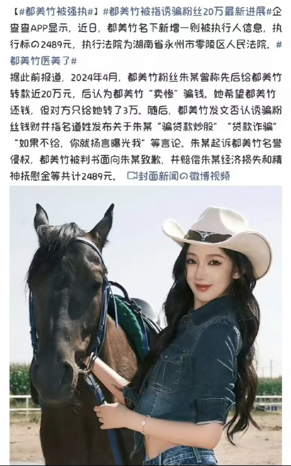 这事儿说起来挺让人唏嘘的。都美竹,就是那个几年前手撕吴某某的女孩,最近又上新闻了。不过这次她不是原告,而是因为2489块钱,被法院强制执行了。