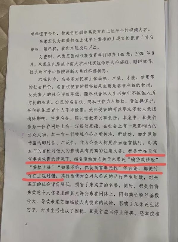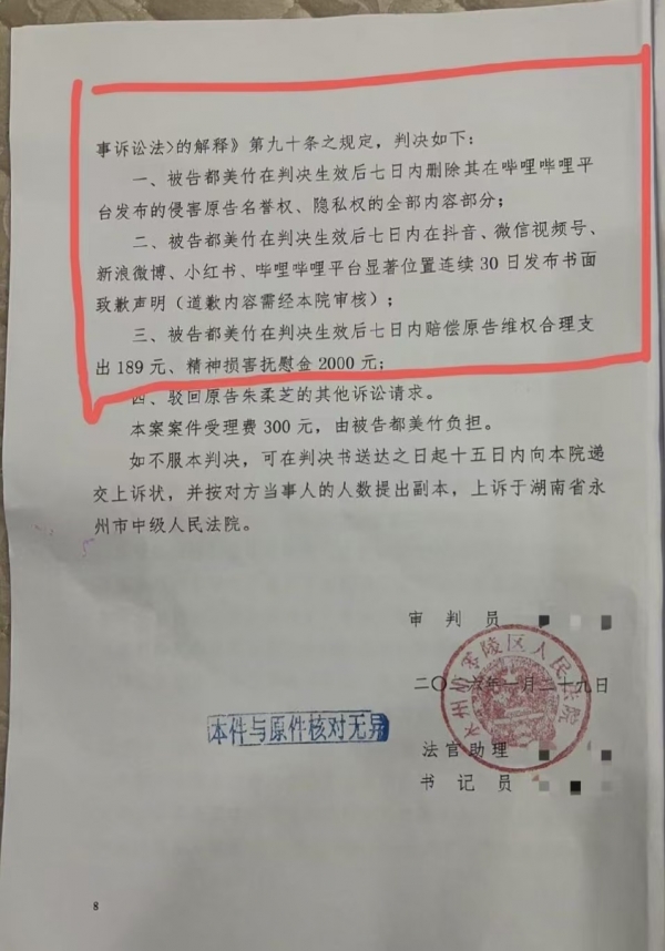 朱姐就把都美竹告了,告她侵犯名誉权和隐私权。法院去年判了,说都美竹作为有三百多万粉丝的大V,说话得负责任。她在没证据的情况下说那些话,还公开别人真名,确实侵权了。法院让都美竹在五个平台上连续道歉30天,还得赔钱,精神损害抚慰金2000块,加上其他费用一共2489元。