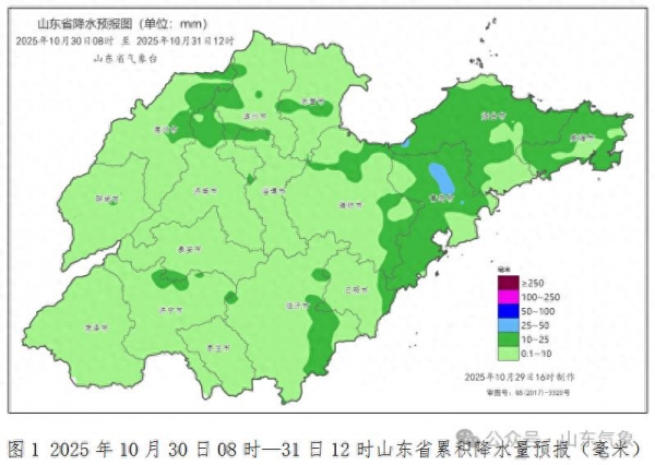 受高空槽影响,预计10月30日白天到31日上午,我省自北向南有一次较明显降雨天气过程,降雨集中时段在30日夜间,全省累积平均降水量5~10毫米(图1),其中,烟台、威海、青岛、潍坊、临沂和日照有小到中雨局部大雨(6~17毫米,局部25~35毫米),其他地区有小雨局部中雨(2~6毫米,局部10~20毫米)。此次降雨过程有利于降低森林火险等级,但前期土壤过湿地块散墒整地仍未完成,需关注降雨对秋收秋种等的不利影响。