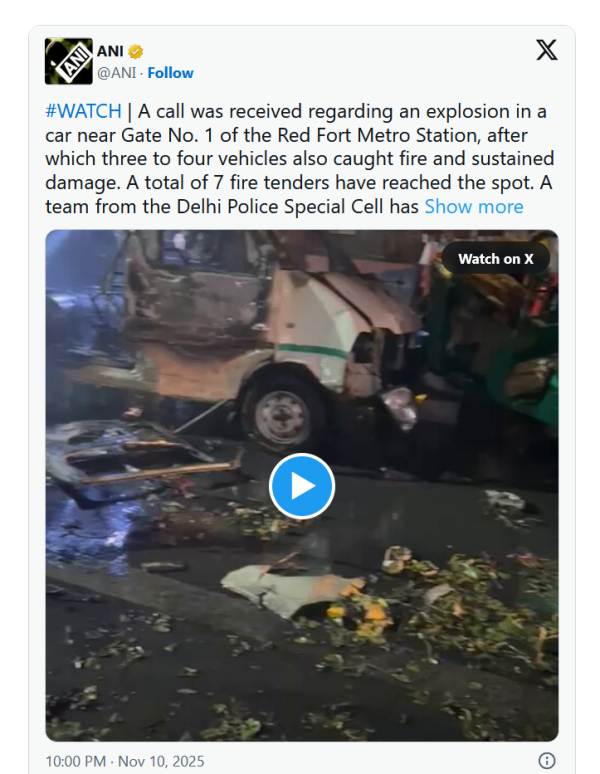 印度《经济时报》、新德里电视台报道,当地时间11月10日晚间,印度德里地区红堡地铁站附近发生一起汽车爆炸事件,引发火灾,多辆汽车损毁,至少8人死亡,24人受伤。