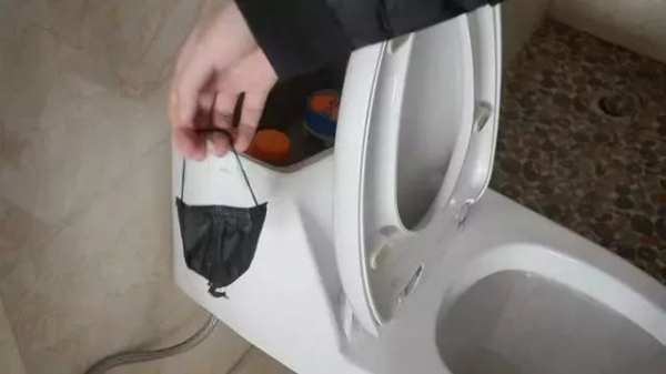 第四步:把扎好的口罩放到马桶后面的水箱里,然后盖上水箱盖,夹住口罩挂耳绳就可以了。
