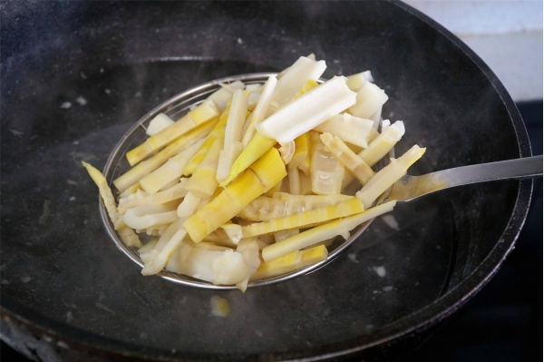 竹笋买回来后,先切成块,用开水焯水5 分钟,焯水能去除大部分草酸,避免草酸与钙结合形成草酸钙,减少结石风险。