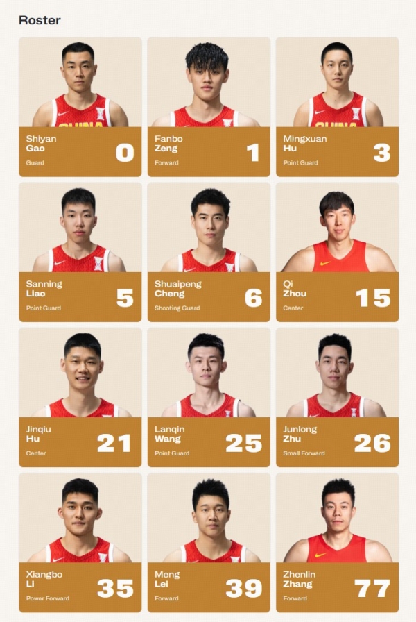 中国男篮12人大名单:高诗岩、曾凡博、胡明轩、廖三宁、程帅澎、周琦、胡金秋、王岚嵚、朱俊龙、李祥波、雷蒙、张镇麟。
