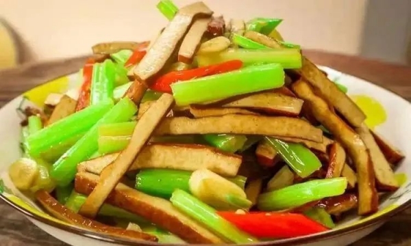 材料:芹菜、香干、红椒、盐、生抽、鸡精