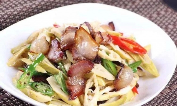 1. 春笋去皮切片,焯水后捞出;腊肉切片;青红椒切丝,蒜切末。