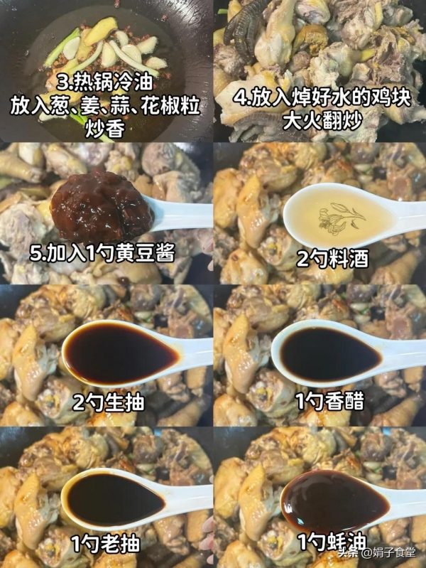 食材:鸡肉、香菇、葱姜蒜、花椒、八角、香叶、干辣椒、冰糖、料酒、黄豆酱、生抽、老抽、香醋、蚝油、食盐、葱花