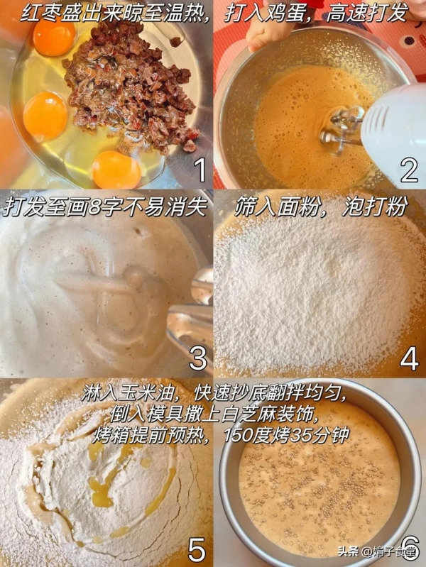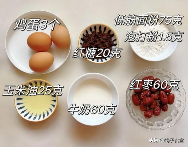 食材:鸡蛋、红糖、低筋面粉、泡打粉、玉米油(味道淡的食用油都可以)、纯牛奶、红枣