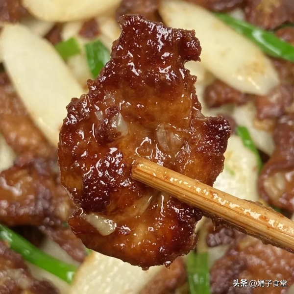 1、猪梅花肉切片,加1勺生抽、半勺老抽、适量淀粉、少许食用油,抓匀腌制15分钟。