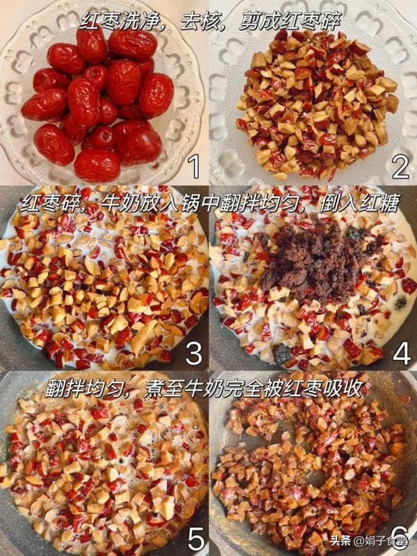 1、红枣洗净去核,然后剪成小一点的红枣碎,红枣碎和纯牛奶一起倒入锅中翻拌均匀,再倒入红糖,开小火,翻拌至牛奶完全被红枣吸收,盛出来晾至温热。