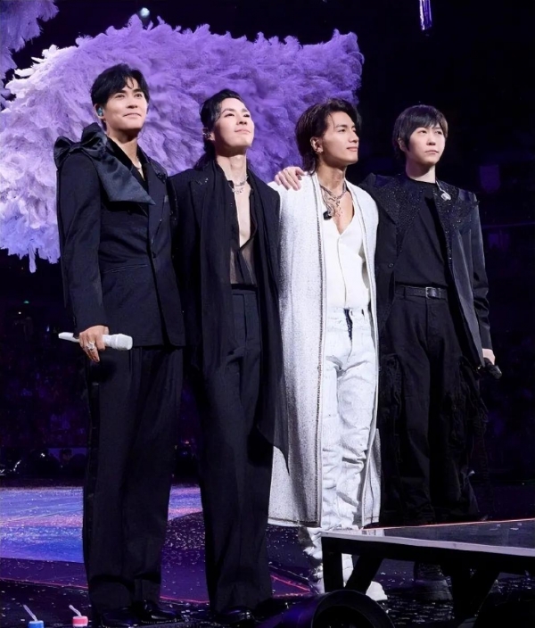最让人破防的是F3的反应:吴建豪穿着白外套第一个疯跑过去,言承旭和周渝民紧随其后,三个大男人围着阿信又是扶又是抱,眼神里全是慌神的担忧。等阿信站稳后,还笑着指着自己的脸颊求亲,周渝民和吴建豪立马凑上去轻吻,把惊险瞬间变成了双向奔赴的温暖,台下粉丝一边抹眼泪一边大合唱,这场景谁看了不鼻酸?