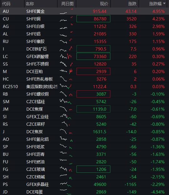 商品:国内商品期货多数下跌,截至发稿,沪金涨近5%,沪铜涨超3%,沪银涨近3%,铝、橡胶涨超1%,集运指数、铁矿石、不锈钢等小幅走高,碳酸锂、豆粕、热卷板、螺纹钢、锰硅、工业硅、菜籽、焦煤走低,氧化铝、纸浆、焦炭、玻璃、燃油等跌超1%,沥青、多晶硅、烧碱跌超2%,鸡蛋跌超5%。