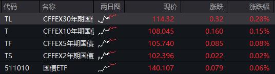 债市:国债期货全线反弹,截至发稿,30年期主力合约涨0.28%,10年期主力合约涨0.15%,5年期主力合约涨0.08%,2年期主力合约涨0.02%。
