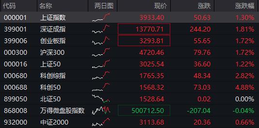 10月9日,A股午后延续涨势,三大股指集体涨超1%,沪指攻破3900点关口,为2015年8月以来首次,创业板逼近3300点,科创50大涨近5%,半导体产业链持续大爆发,华虹公司20CM涨停。