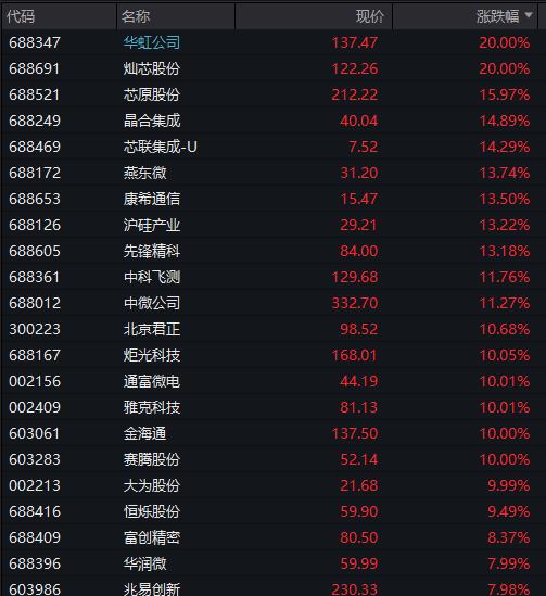 存储芯片是重要主线,华虹公司逼近20%涨停,雅克科技、深南电路、通富微电、赛腾股份、太极实业集体封板;兆易创新冲击涨停,股价创历史新高。